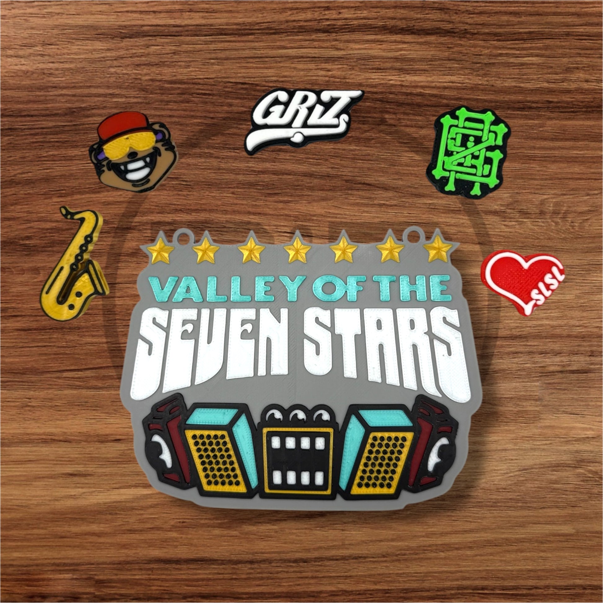 3D printed GRiZ Valley of the Seven Stars festival pendant. Your choice of the pendant by itself or including a set of the matching GRiZ kandi beads pictured.