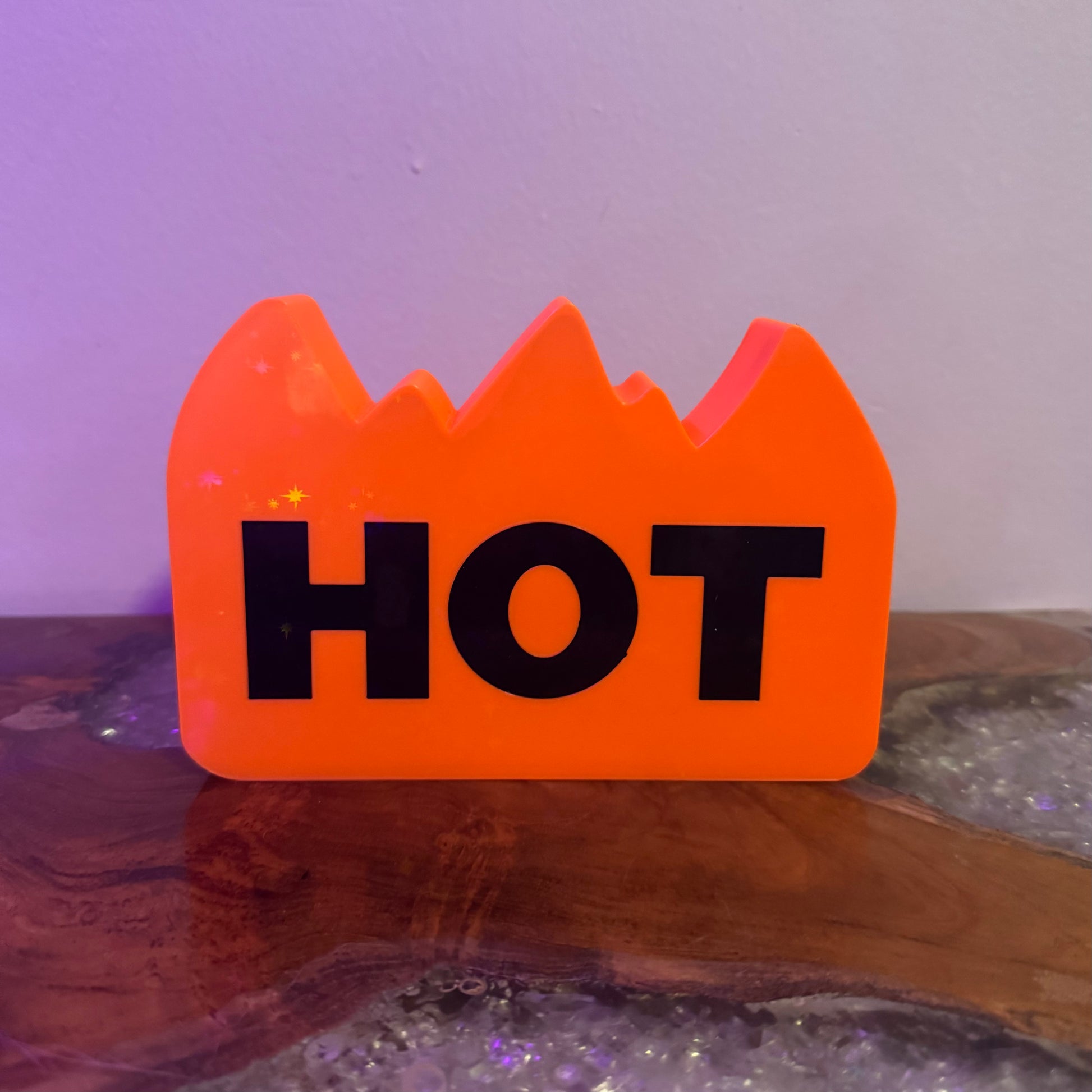 This hand-crafted LED light box glows in that unmistakable vivid orange, mimicking the iconic "HOT FOOD" sticker design — bold black block letters on a bright, juicy background. It's a fun conversation starter, a cheeky gift, or the ultimate addition to your food-themed aesthetic.